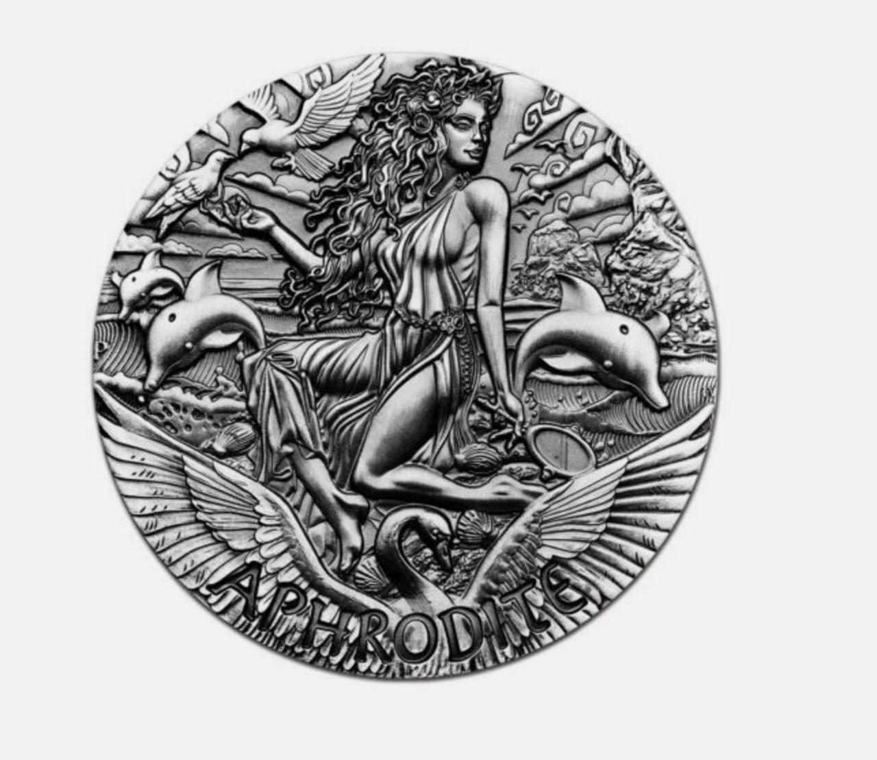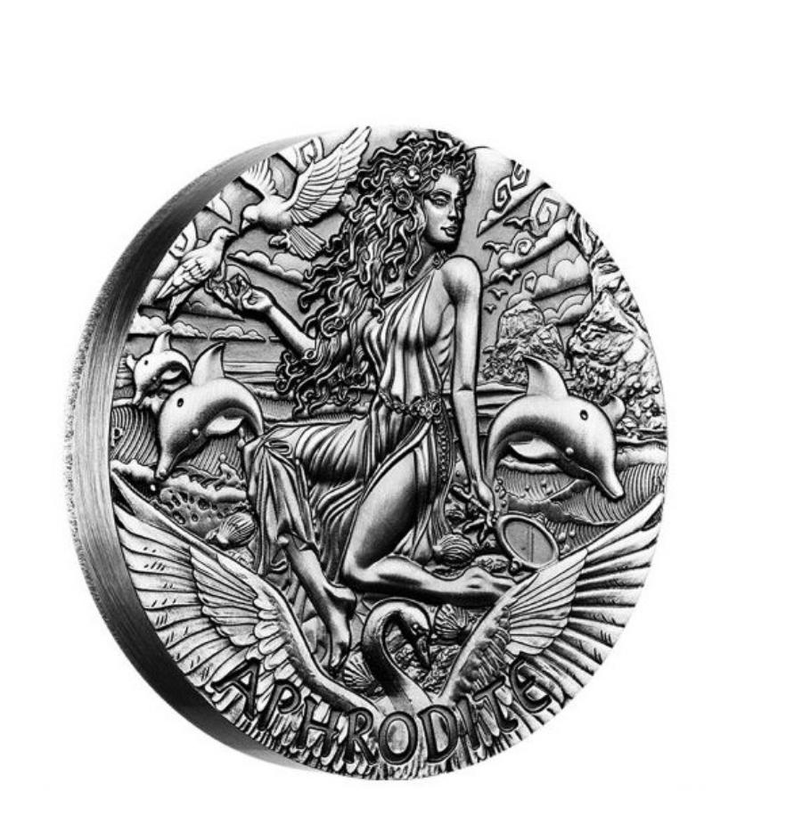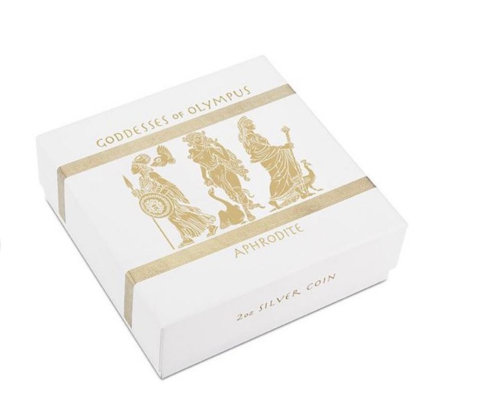 The Perth Mint’s Goddesses of Olympus series depicted three of the leading female deities of Greek mythology on the reverse of high-relief, rimless 2 oz antique silver coins. The final issue of that series was the coin honoring Aphrodite, the most beautiful goddess in mythology and the one responsible for love, pleasure, passion, and procreation.