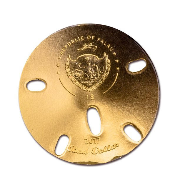 Sand dollars are popular souvenirs collected by tourists and beachcombers around the world. The sun-bleached skeletons of these sea urchins resemble old Spanish and American dollar coins, which lead early settlers to refer to them as sand dollars. In Spanish speaking countries they are often known as ?galleta de mar? – sea biscuit or sea cookie. The gold coin represents a sand dollar in a very literal sense. It carries a face value of one dollar issued by the Republic of Palau. The coins feature a realistic reverse design and shape. Silver coin is Palau’s coat-of-arms and five cut-out holes.