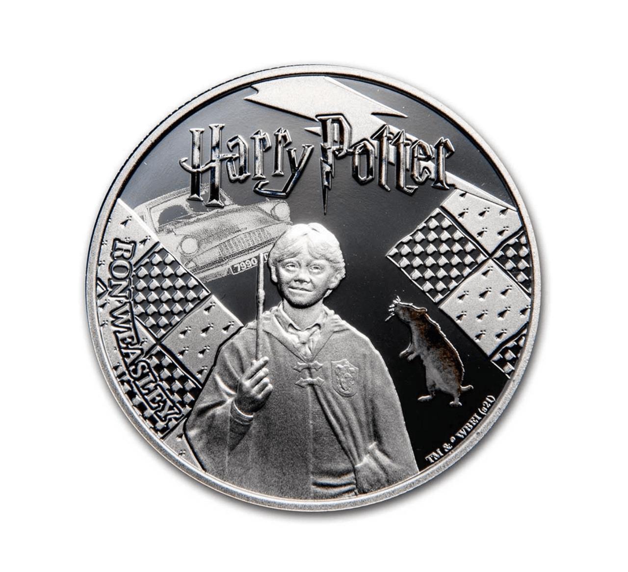 - Reverse: Each coin features three main characters: Harry Potter, Hermione Granger and Ron Weasley. Each character is holding their magic wand..