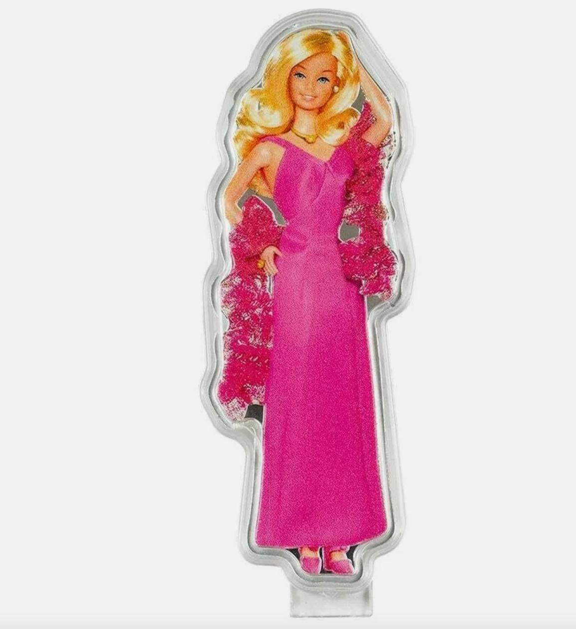 - Reverse: Showcases a vibrantly colorized depiction of Superstar Barbie in a pink evening gown with a rose-colored boa draped around her shoulders. In typical Barbie fashion, her outfit is enhanced with accessories and her iconic pink heels!