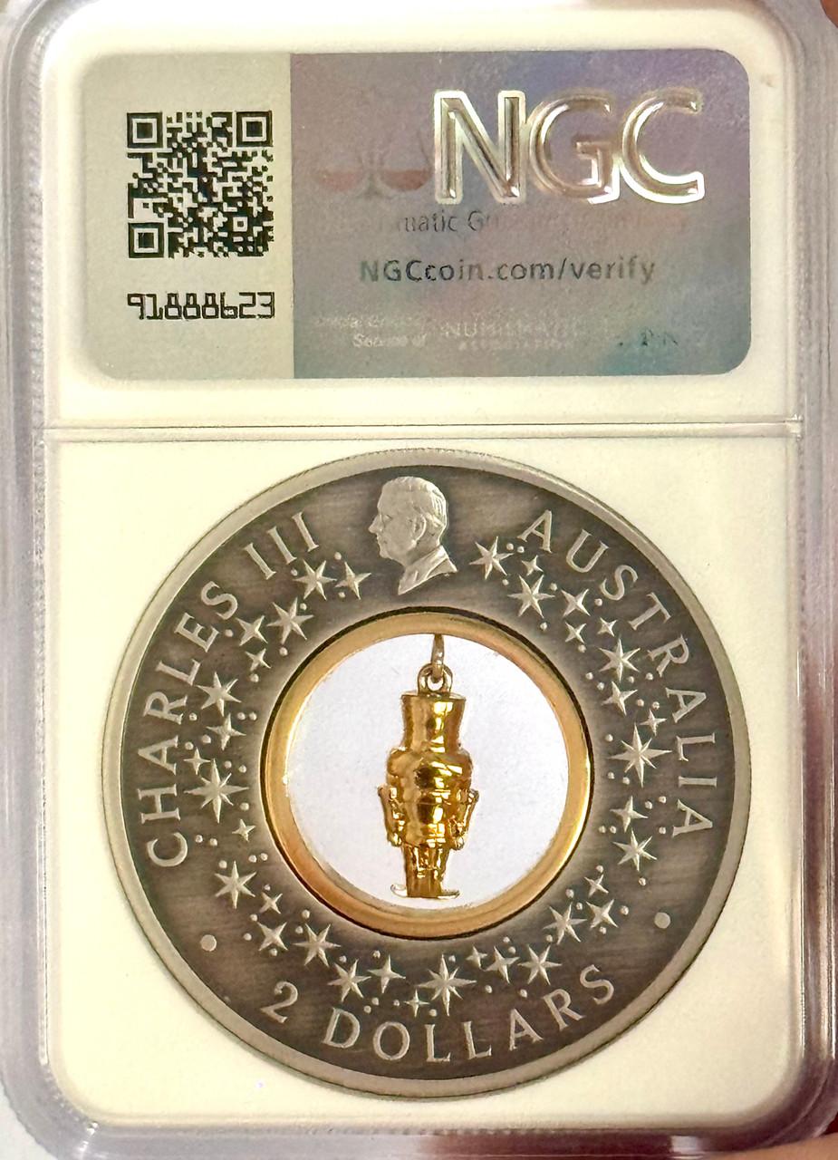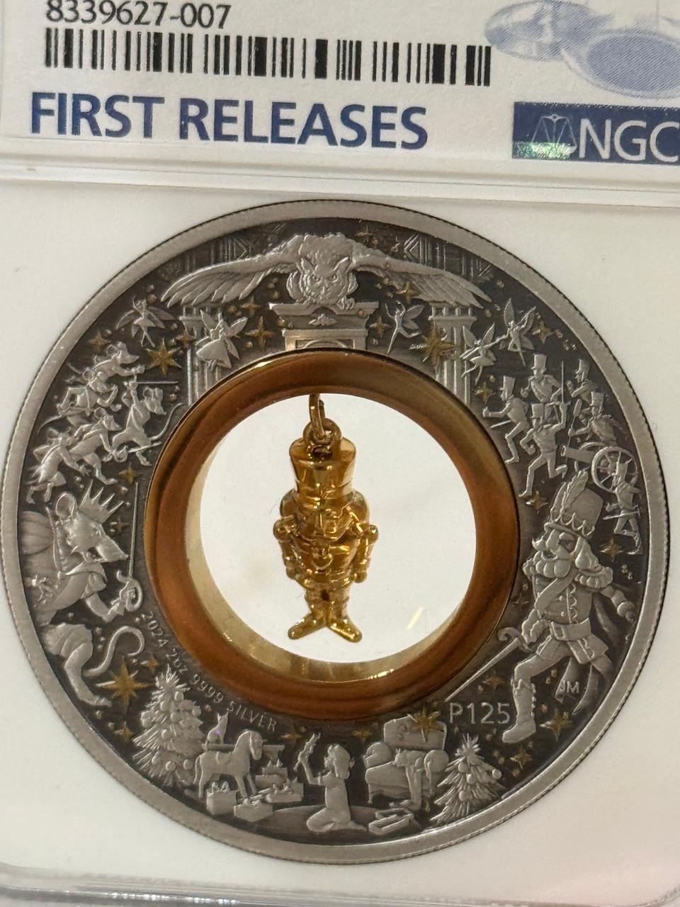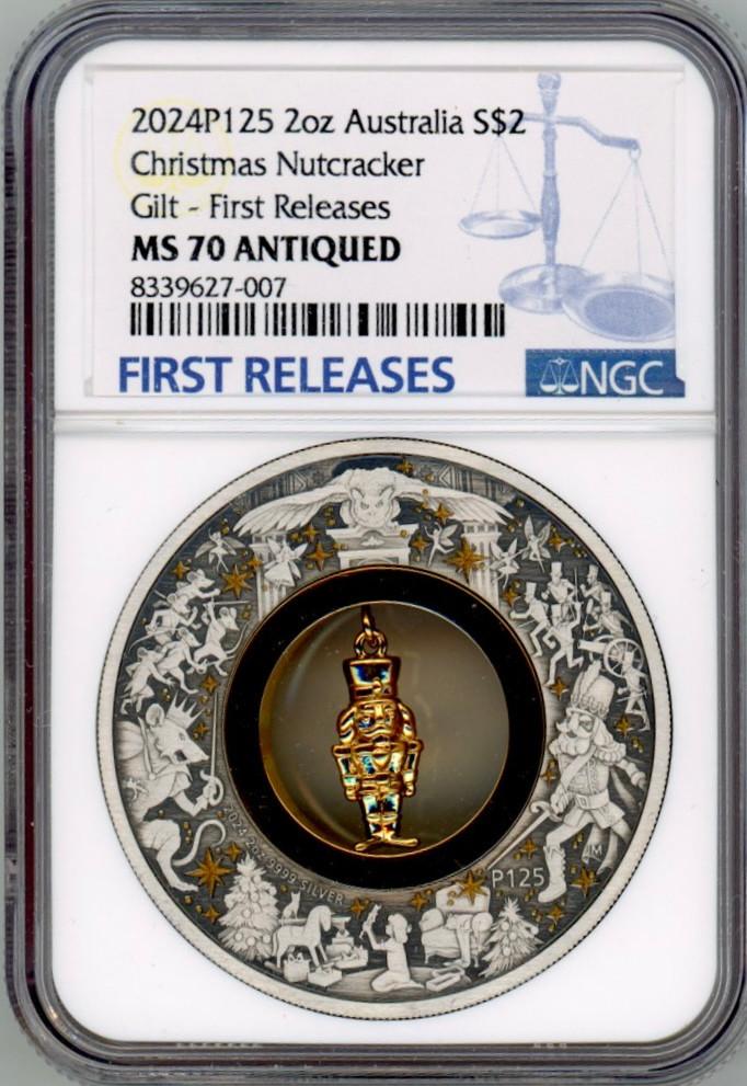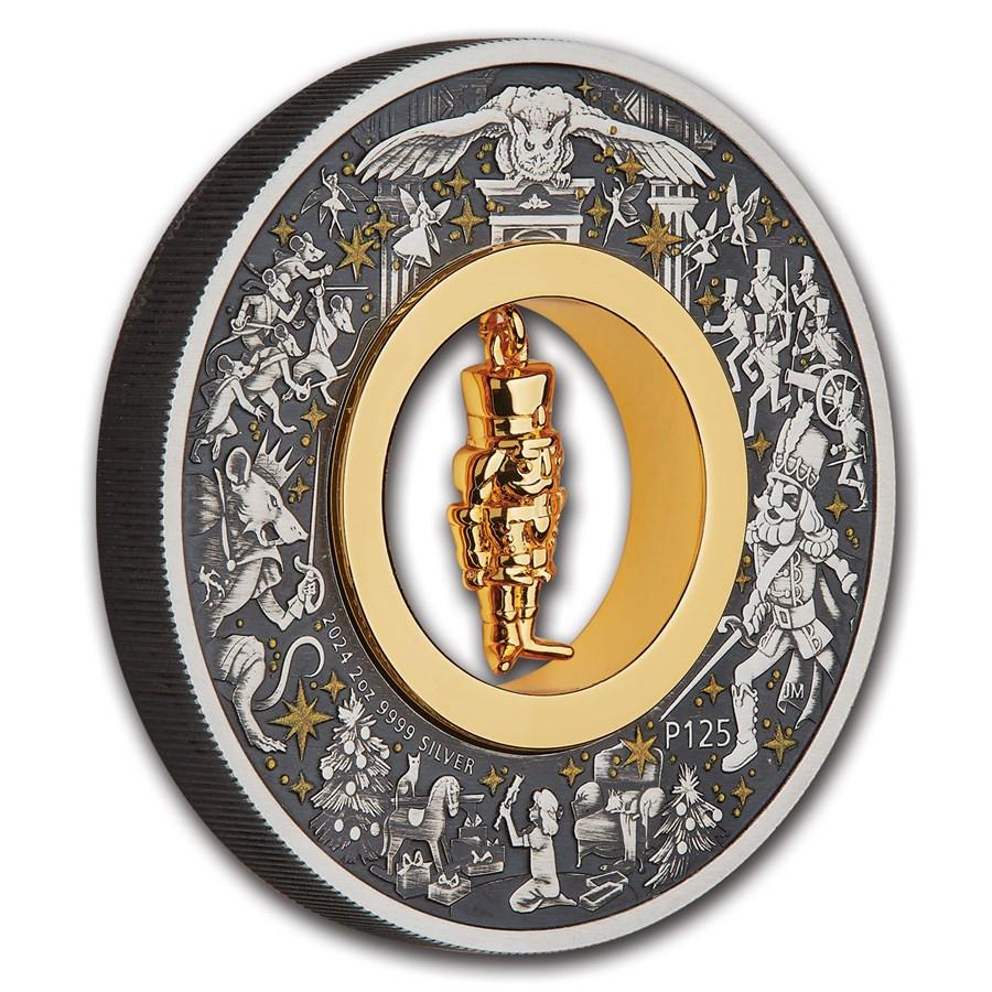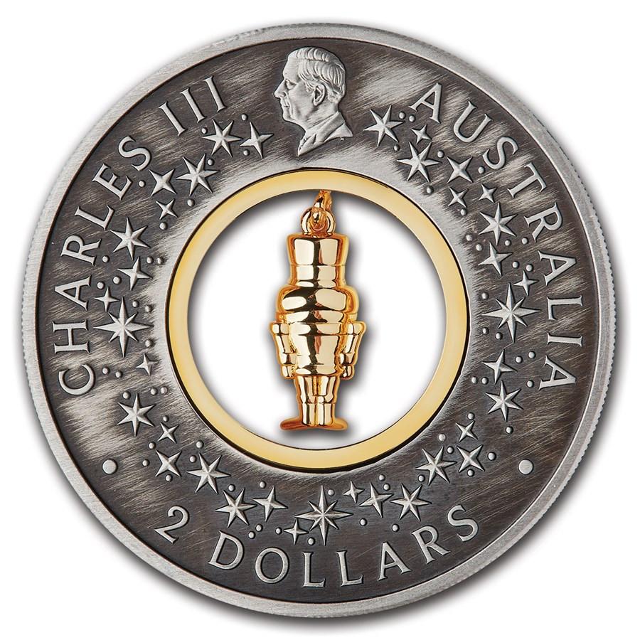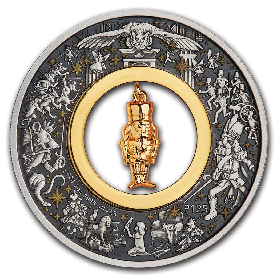 - Reverse: The coin portrays a traditional hearth on Christmas Eve. The fairy-tale's leading characters are depicted in the field design, including the Nutcrackers, his foe the Mouse King and a young girl among Christmas gifts. The popular Christmas Perth Mint’s "P125" mint mark, in celebration of The Perth Mint's 125th anniversary is also included in the design. Encased in the coin’s center is a 24-carat gold-plated Nutcracker.