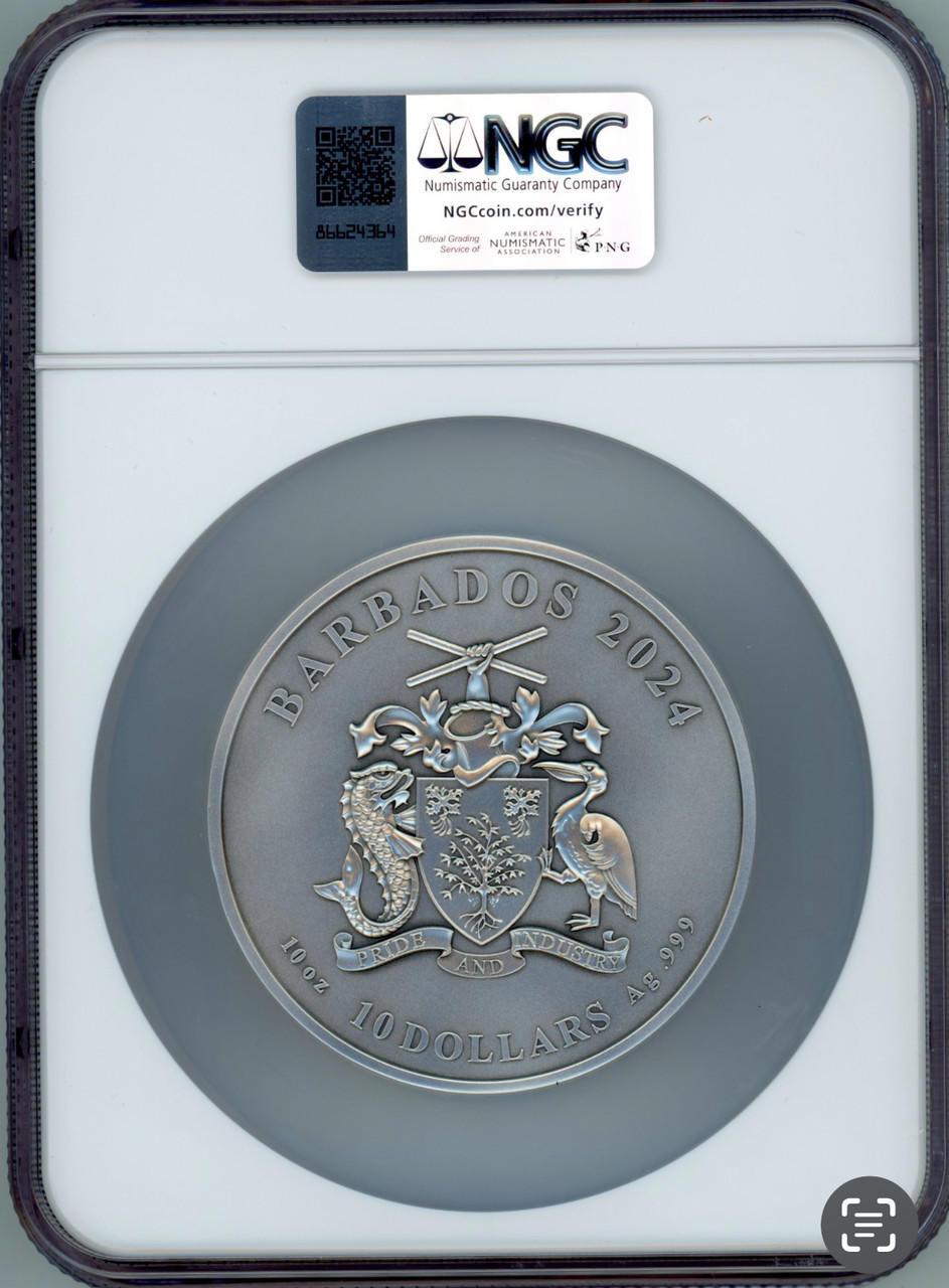 Features the Coat of Arms of Barbados, along with the inscriptions: “BARBADOS”, ''2024'', “10 oz”, “10 DOLLARS”, “Ag .999”.
