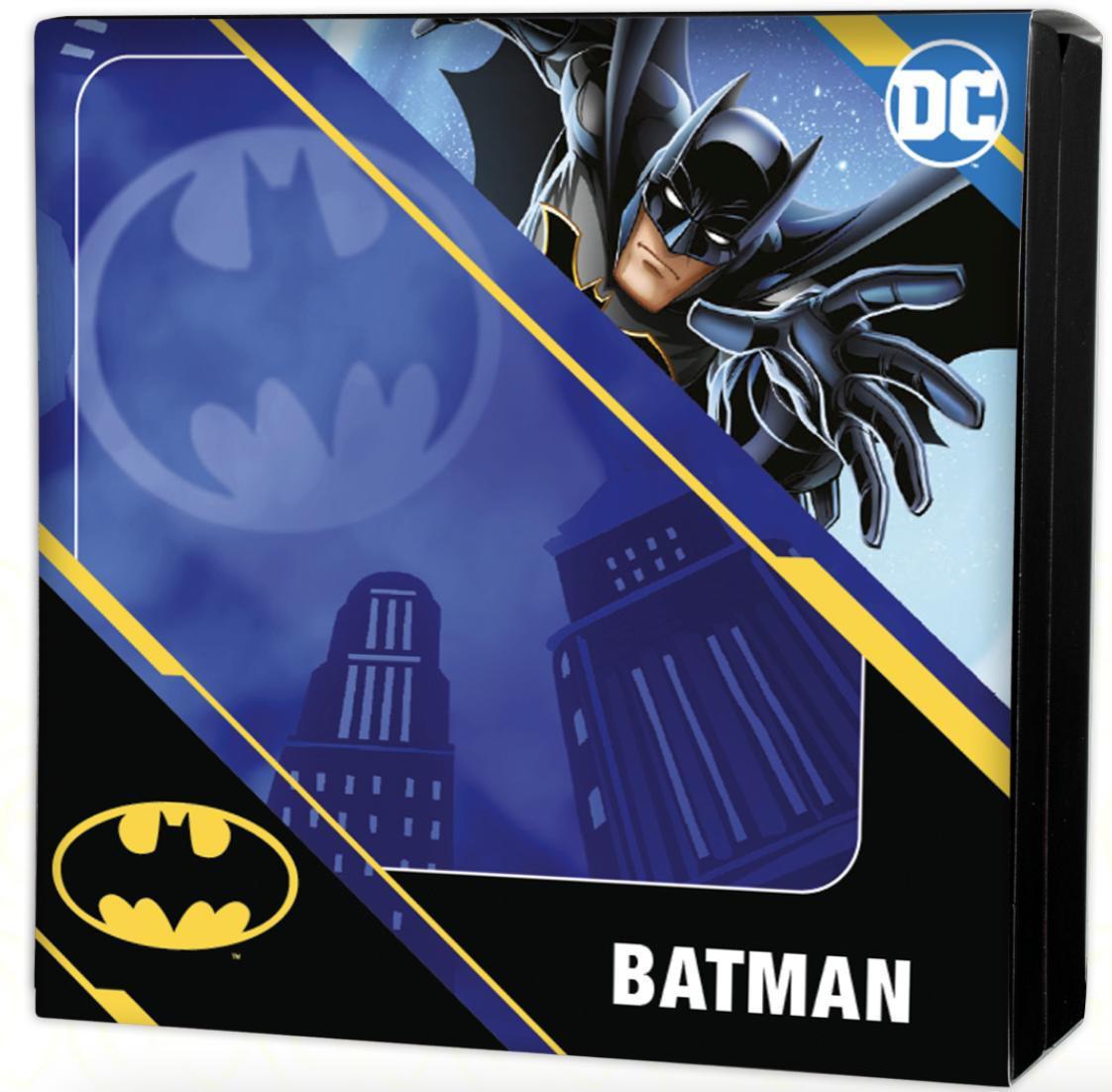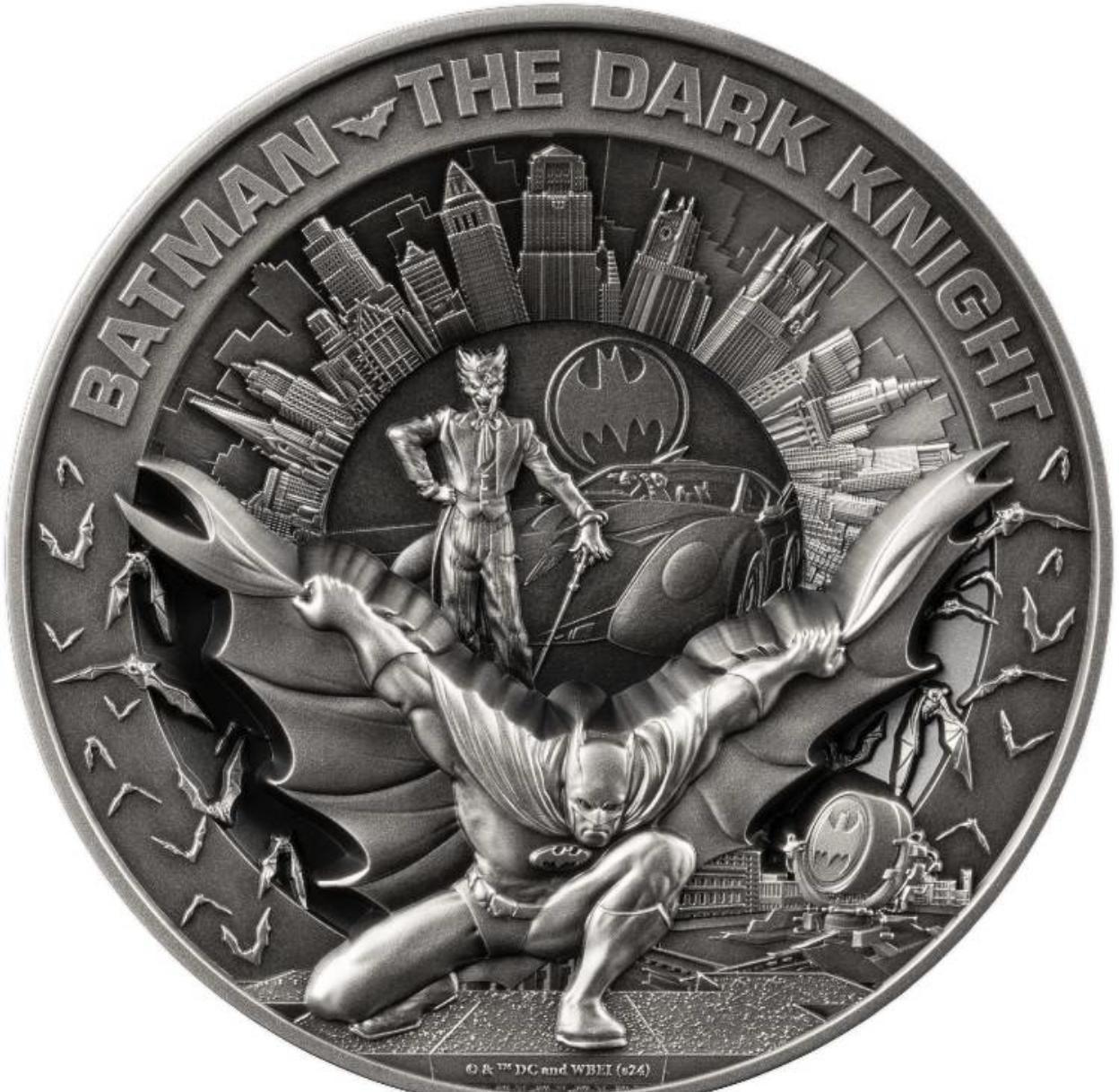 First-ever 10 oz coin minted with the stunning Multiple Layer Technique. It impresses with a detailed design, featuring the iconic Batmobile, the villain Joker and the Gotham City skyline.