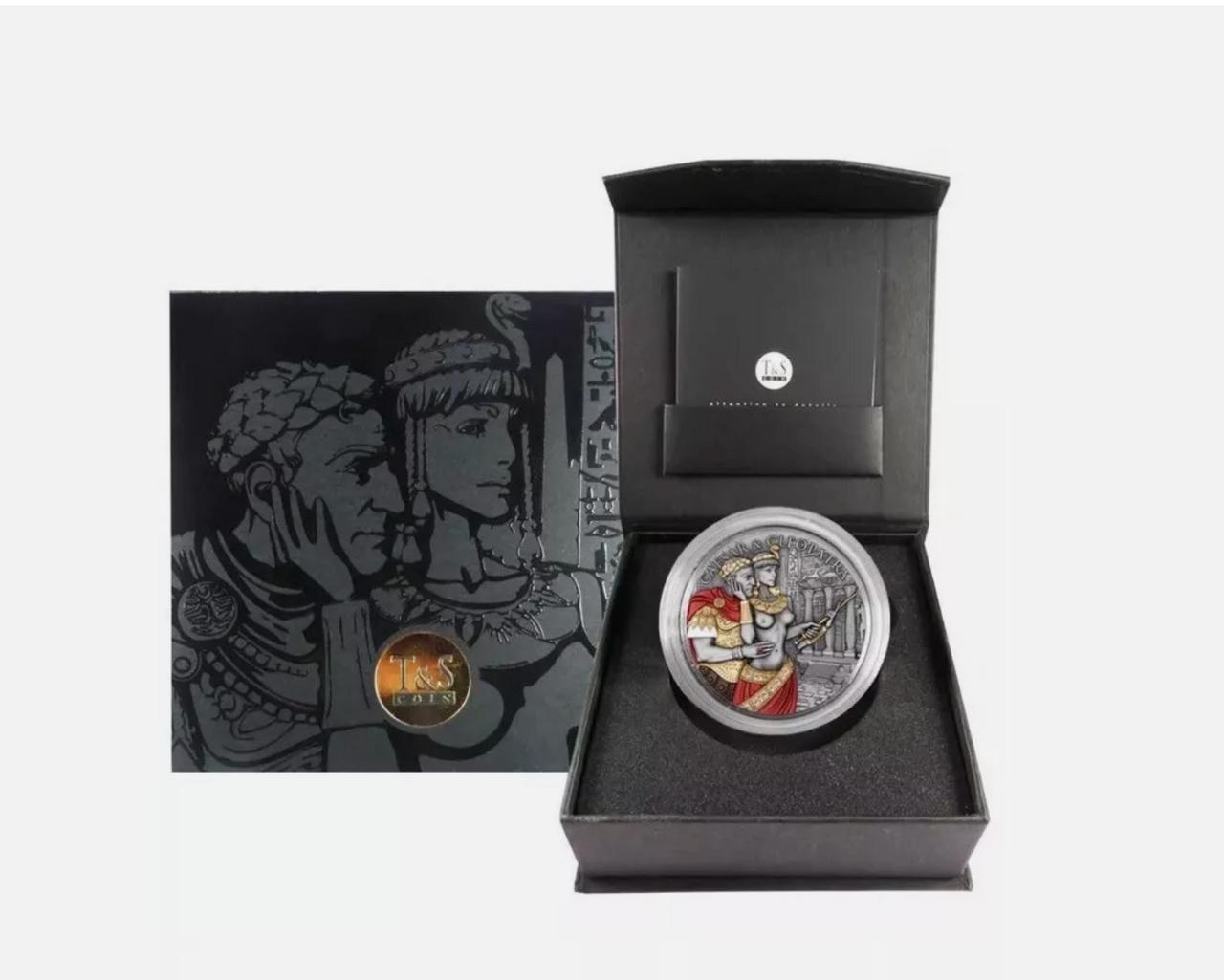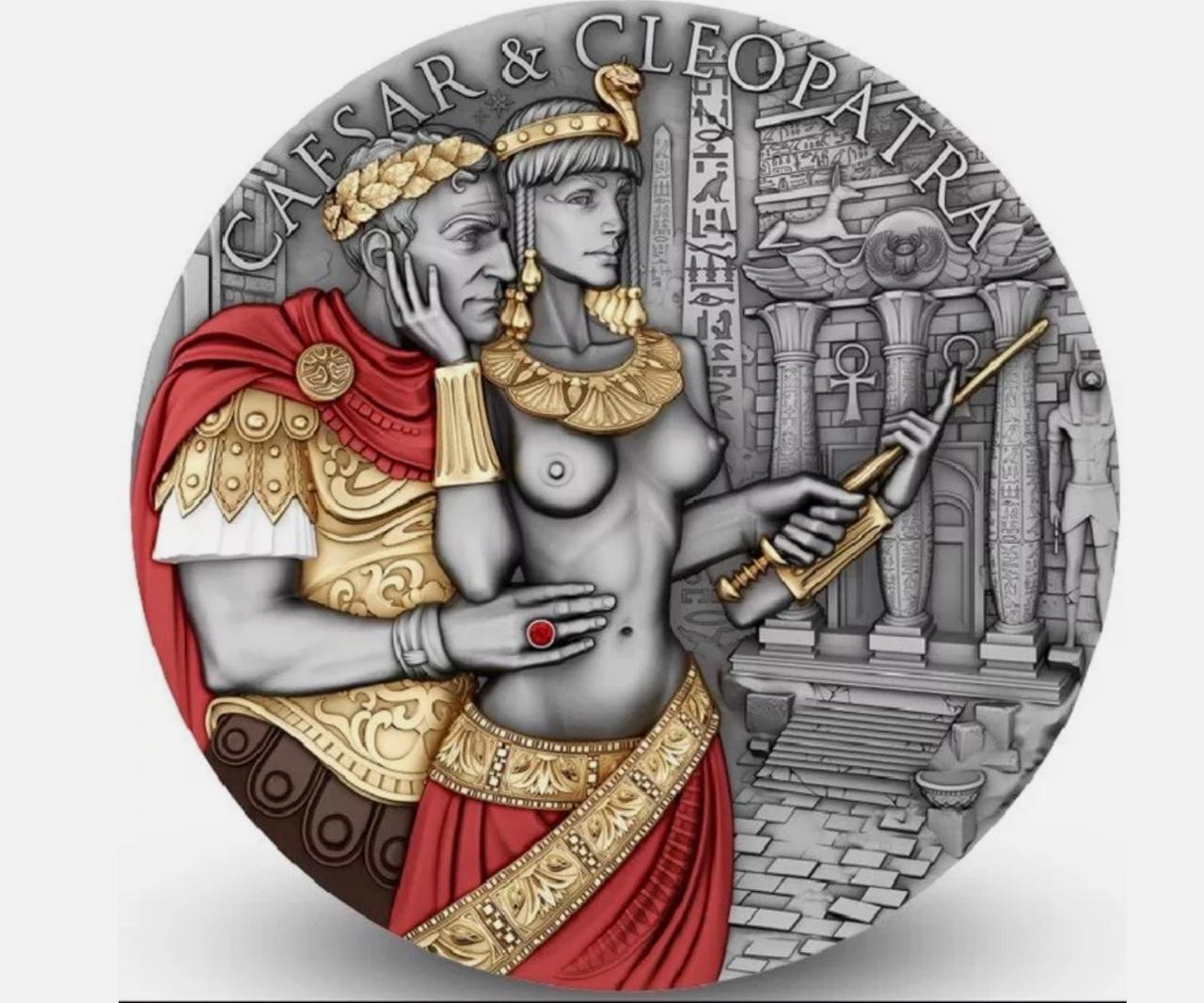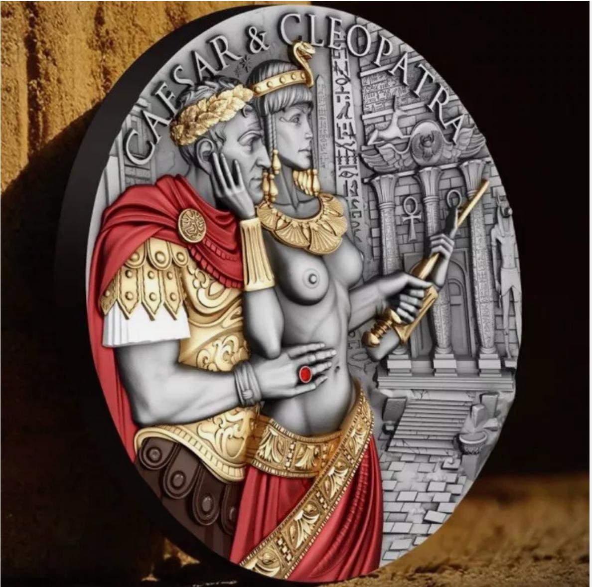 Intricate relief work brings every element to life, while the stunning coin design captures a serene and intimate moment between Caesar and Cleopatra, perfectly illustrating the strength and harmony of their legendary union. The real ruby set in Caesar’s ring serves as a beautiful symbol of love and passion, while also reflecting its historical role as a stone worn by kings and queens as a sign of power and authority. This adds an extra layer of depth to their story and highlights the powerful connection they shared.