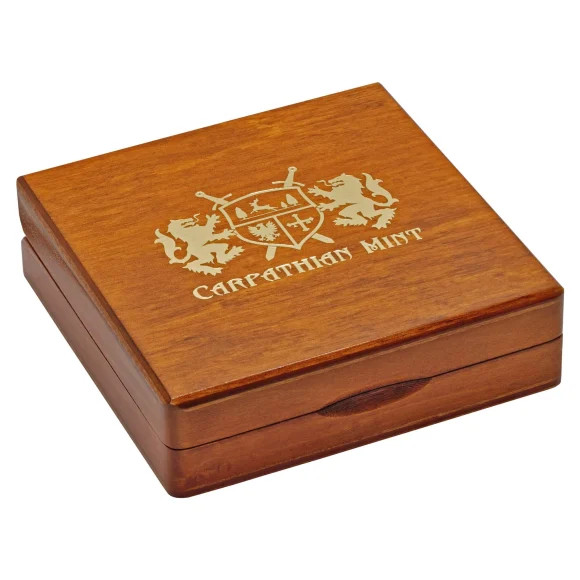 This unique version has been ennobled on both sides with ruthenium, palladium and rose gold, carefully highlighting each element of the scene so that it can be better appreciated. The coin’s base is ruthenium plated, the red horse is rose gold plated and the horseman, letters and Carpathian Mint shield is palladium plated.