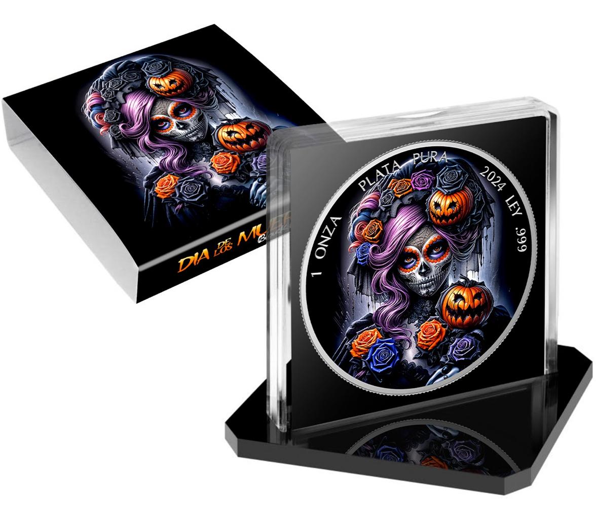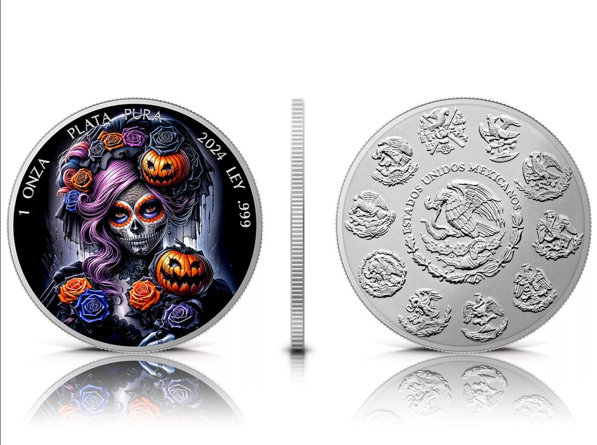 This haunting 1 Oz Silver coin is a tribute to the Mexican Day of the Dead, where beauty flirts with death. This edition resurrects the dark poetry of Halloween, draped in beauty and macabre. The haunted pulse of Halloween exhales in brilliant colors. A dance of darkness and desire. Cold beauty blooming from nightmares. Scent of roses and ruin. The coin is sealed in a capsule with its Certificate of Authenticity. Only 200 pieces in the world. The reverse of this Silver coin resurrects the spirit of Halloween. A sugar-painted beauty. She rises from the dark. Her gaze sharp enough to pierce souls. Bright roses twist through her hair. Small carved pumpkins grin with quiet menace. Her hair glows in ghostly purple. On the reverse, also the inscriptions: "1 ONZA" – the weight of the coin, "PLATA PURA" – the specification of pure Silver, "2024" – the year of issue, and "LEY .999" – the fineness of Silver. The obverse of this Silver coin holds the stillness. Mexico's Coat of Arms, proud and fierce, crowned with the inscription: "ESTADOS UNIDOS MEXICANOS" – the country of issue.