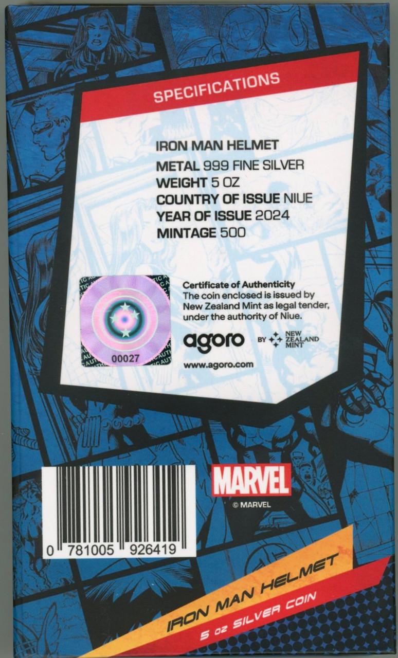 Agoro by New Zealand Mint painstakingly recreates the mask of Iron-Man in full detail with this beautiful 5 oz silver coin!