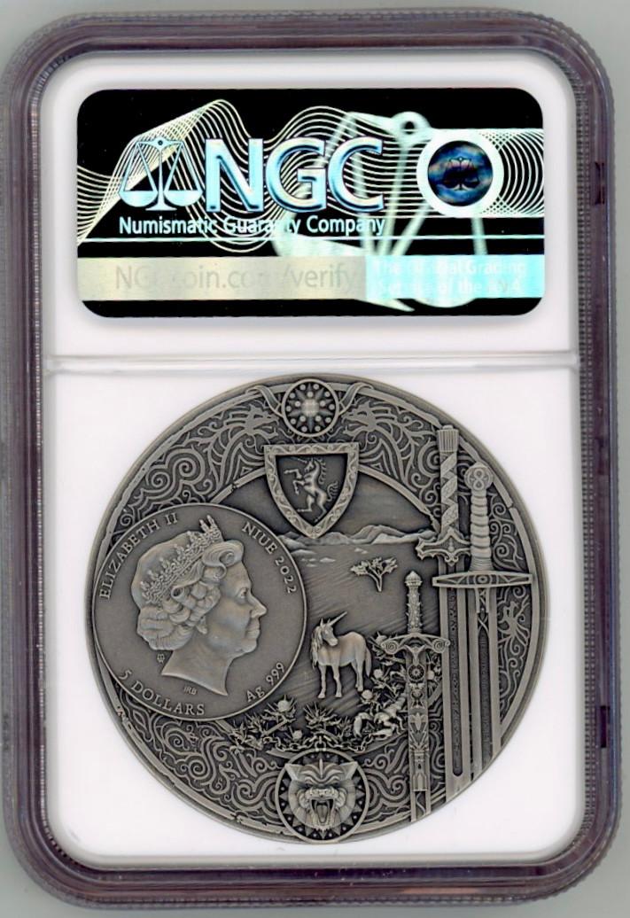 - Reverse: Features Ciri with his dagger, which is highlighted with selective Gold gilding standing next to the unicorn. The unicorn horn is a mother of pearl insert.