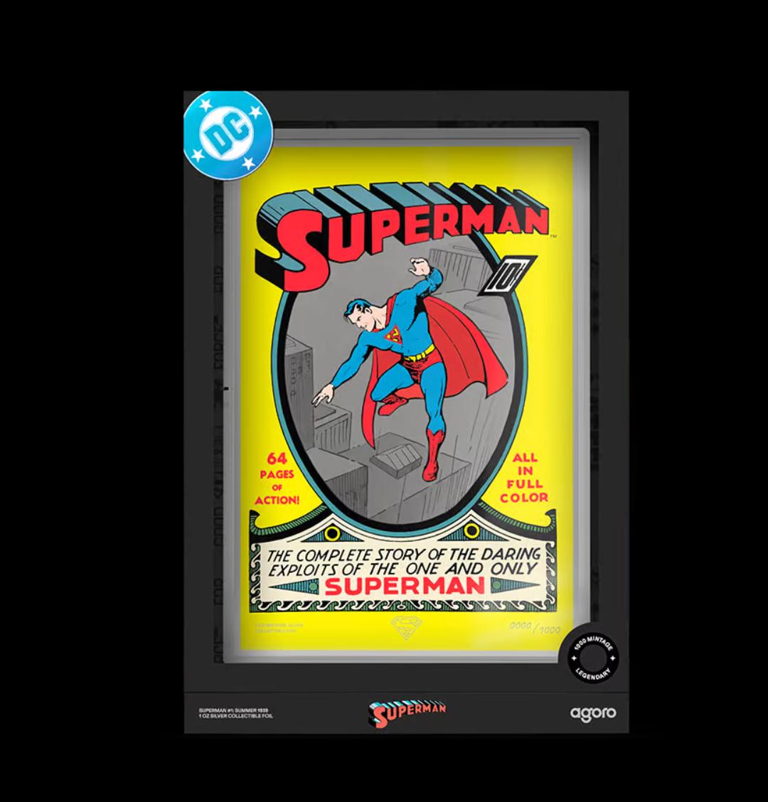 • A 1oz 999 pure silver collectible featuring the original cover of SUPERMAN #1 (Summer 1939) in its original colors