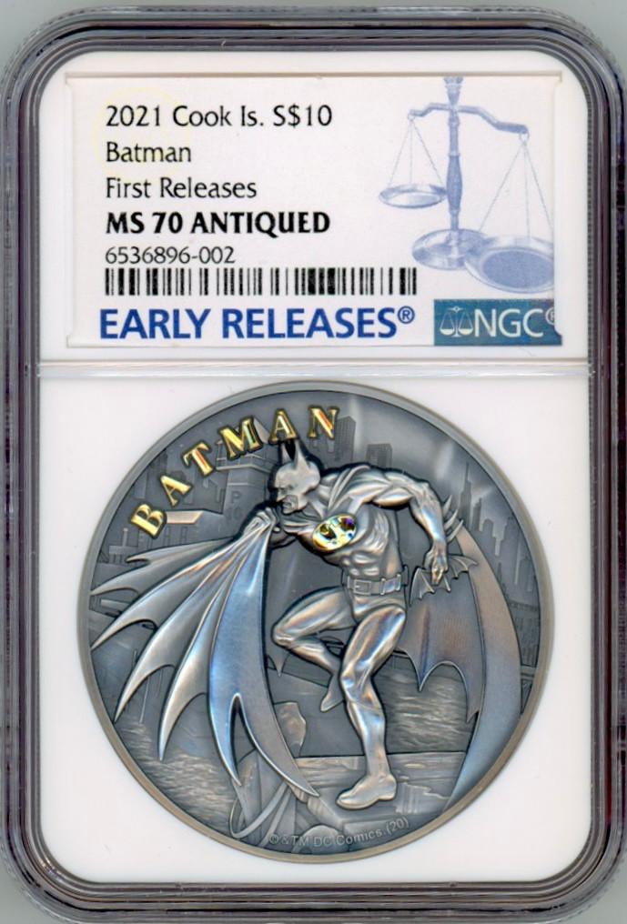 BATMAN 2 oz Silver High Relief Gilded Coin $10 Cook Islands 2021 NGC 70 Early RELEASE LABEL